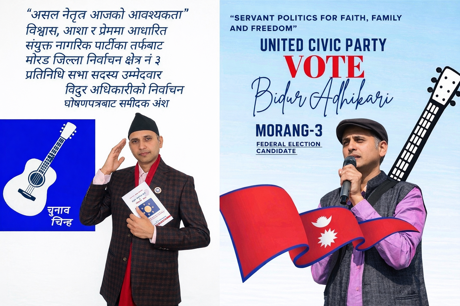 संयुक्त नागरिक पार्टीका सहमहासचिव, प्रवक्ता तथा विदेश विभाग प्रमुख विदुर अधिकारीले मोरङ निर्वाचन क्षेत्र नं. ३ बाट प्रतिनिधिसभा सदस्यका लागि उम्मेदवारी घोषणा गर्दै विस्तृत निर्वाचन घोषणापत्र सार्वजनिक गरेका छन्। उनले भ्रष्टाचार, नातावाद, कृपावाद र संरचनागत अन्यायको अन्त्य गर्दै न्यायपूर्ण, समतामूलक र समृद्ध राष्ट्र निर्माण गर्ने प्रतिबद्धता व्यक्त गरेका छन्।